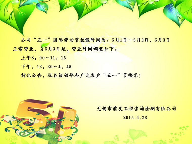 網(wǎng)址: http://www.szsldzkj.com| 關(guān)于“五一”節(jié)放假及節(jié)后營(yíng)業(yè)時(shí)間調(diào)整的公告 | ||