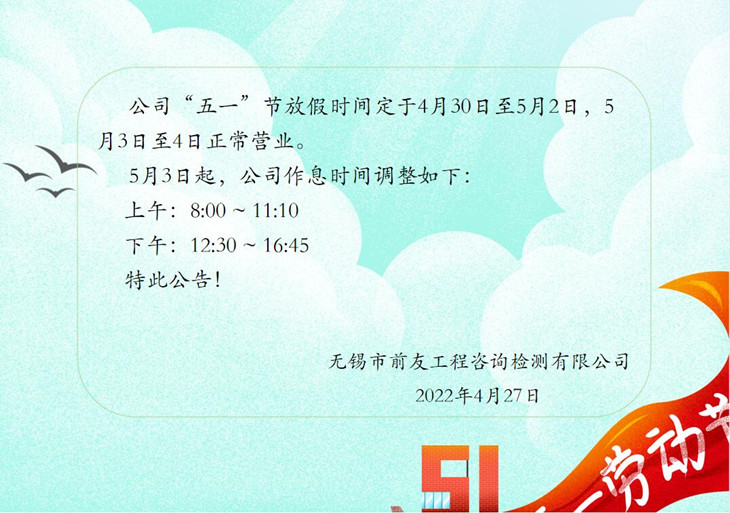 | 關(guān)于“五一”勞動(dòng)節(jié)放假及節(jié)后營(yíng)業(yè)時(shí)間調(diào)整的公告 | ||