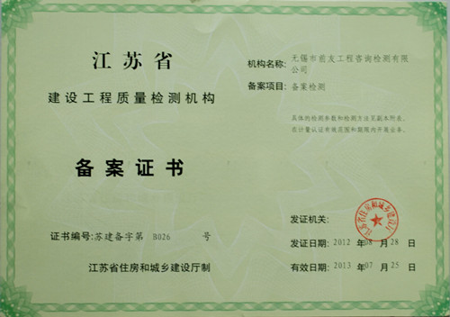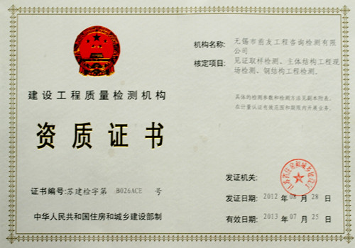 自公司申請資質(zhì)(增擴項)后,先后通過市建設(shè)局組織的現(xiàn)場考核,省建設(shè)行政審批中心初審、復(fù)審,網(wǎng)上公示、公告,于8月28日,省住建廳批準并頒發(fā)了新的檢測資質(zhì)證書。這次新增擴項包括:鋼結(jié)構(gòu)工程檢測;建筑節(jié)能工程熱工性能現(xiàn)場檢測、中空玻璃露點檢測;建筑水電類開關(guān)、插座檢測。 經(jīng)過六年多的辛勤耕耘,無錫市前友檢測公司在各級主管部門的領(lǐng)導(dǎo)和關(guān)心下,在廣大客戶的支持和配合下,在全體職工的不懈努力下,檢測能力逐步提高,至今,已具備了以下檢測資質(zhì)能力項目: 見證取樣類:水泥物理力學性能;鋼筋(焊接連接)力學性能;砂、石常規(guī);混凝土、砂漿強度;簡易土工;混凝土摻加劑(外加劑、粉煤灰);瀝青、瀝青混合料;預(yù)應(yīng)力鋼絞線、錨夾具、金屬螺紋管。 專項檢測類:主體結(jié)構(gòu)工程現(xiàn)場檢測(包括鋼筋保護層、現(xiàn)場強度檢測、結(jié)構(gòu)性能、后置埋件力學檢測、建筑物沉降觀測);鋼結(jié)構(gòu)工程檢測(包括鋼結(jié)構(gòu)工程用鋼材、連接件、鋼結(jié)構(gòu)焊縫質(zhì)量、防腐防火涂層、鋼結(jié)構(gòu)變形);建筑節(jié)能檢測(建筑節(jié)能材料檢測和建筑節(jié)能現(xiàn)場檢測)。 備案檢測類:室內(nèi)環(huán)境檢測、建筑水電檢測、墻體、屋面材料、飾面材料、防水材料、門窗檢測。 其它類:相零線檢測、 截面尺寸檢測(現(xiàn)澆樓板厚度檢測)、室內(nèi)空間尺寸檢測。